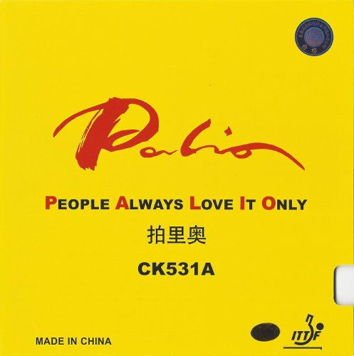 Neue Version des CK 531A, nicht zu verwechseln mit der sogenannten „neuen blauen Edition“. Diese Version ist nicht beklebt! Mit einer neuen, weicheren und elastischeren Gummimischung ist die neue Version des CK 531A etwas langsamer und gefährlicher als die alte Version, bei weniger Kontrolle. Die Form der Noppen des Palio neuen CK 531A ist identisch mit der des Palio CK 531A. Auch optisch sind beide Versionen kaum zu unterscheiden. Der Palio neue CK 531A ist zudem griffiger als die alte Version und kann mehr Rotation erzeugen, ist selbst aber etwas anfälliger für eingehende Rotation. Dadurch eignet sich der Palio neue CK 531A besser für Spieler, die auch mit dem Handgelenk spielen. Der Palio neue CK 531A ist außerdem stärker in der Unterschnitt-Verteidigung. Zusätzlich bietet die neue Version eine verbesserte Haltbarkeit, was die Eignung für einen offensiven Spielstil erhöht.