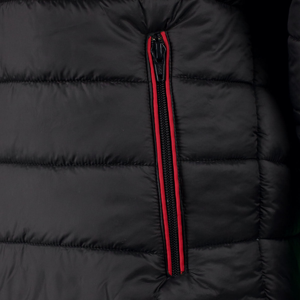 Gepolstertes Polyester-Material mit hohem Tragekomfort. Zwei Reißverschlusstaschen. Schlichtes Design mit roten Farbakzenten auf Brust und Taschen